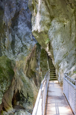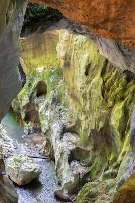 , ensuite la plupart des passerelles sont en bois et on ne voit donc pas sous nos pieds. Certains passages sont en fer et vous avez donc une vue plongeante sur le vide. Durant la descente, je n’ai clairement pas fait la maline, j’avais les jambes qui tremblaient lorsque je suis arrivée en bas. Je n’ai cependant pas regretté un seul instant tant les paysages creusés par l’eau et le temps sont incroyables. Tout est magnifique, je n’en croyais pas mes yeux. L’eau presque turquoise coulant le long des roches, creusant des sillons, des toboggans et des marmites de géants. Pour arriver jusqu’à l’entrée, il vous faudra descendre à travers une forêt de hêtres (et remonter tout ça ensuite, je vous assure que c’était pas spécialement facile).