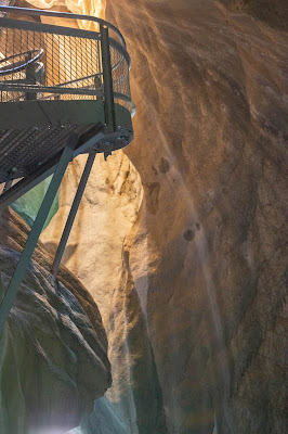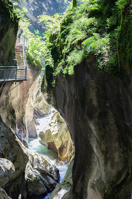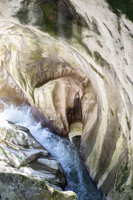 Notre premier arrêt sur la route a été les Gorges du Pont du Diable. Au même titre que les Gorges du Fier, je n’étais pas certaines de réussir à passer sans paniquer totalement. Les gorges du pont du Diable ont été aménagées pour la première fois en 1892, grâce à des passerelles à flanc de falaises permettant de longer les roches juste au-dessus des gorges. L’eau a creusé un sillon énorme et comme nous y étions en été, le niveau de la rivière de la Dranse était plutôt bas. Il ne faut clairement pas avoir le vertige pour descendre mais ça dure un petit moment seulement (le temps d’aller jusqu’aux passerelles)