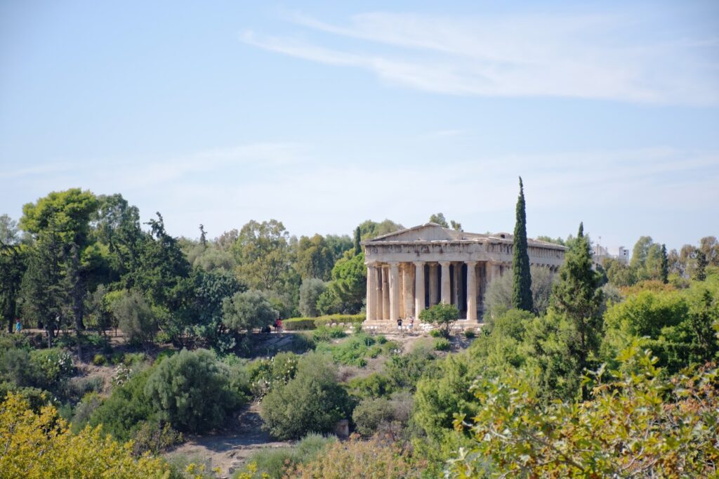 L’Ancien Agora est un site gigantesque, son accès depuis l’entrée côté Acropole étant fermée, il a fallu passer par l’entrée qui se situe proche des ruelles de magasins dont je vous parle plus haut. Il s’agissait de la place principale de l’ancien Athènes. Le temple d’Héphaïstéion a été de très loin mon préféré. Il surplombe toute l’ancienne place et a servi du 7ème siècle jusqu’en 1834 d’église orthodoxe. Ce temple est entouré de verdure, on peut en faire le tour mais pas entrer à l’intérieur. Au-dessus des colonnes vous pourrez apercevoir une frise.