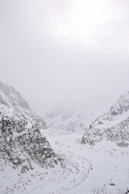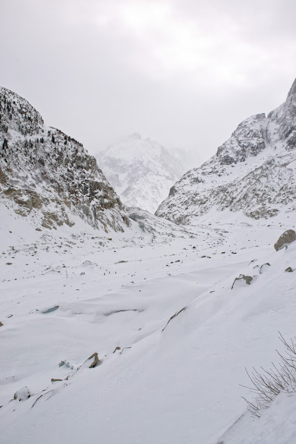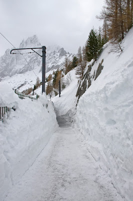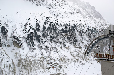 Vous la verrez en contrebas, elle est le témoin irréfutable du changement climatique ! Il y a 100 000 ans, elle se terminait à une vingtaine de kilomètres de Lyon – aujourd’hui, elle ne descend même plus jusqu’à Chamonix ! Actuellement, la mer de glace mesure 7km et son épaisseur maximale est de 300m. Pour les amateurs, il est possible de la descendre en ski – le départ peut se faire à l’aiguille du midi (8h de descente si je ne me trompe pas). La mer de glace étant recouverte de neige à cette période de l’année, nous apercevons très peu le glacier qui se cache dessous – le paysage reste splendide mais c’est un peu notre regret. Je pense qu’il est intéressant de retourner le voir en été afin de mieux nous rendre compte de l’étendue du glacier. Il faut savoir qu’actuellement, le glacier perd 120 à 90m d’épaisseur et de longueur par an.