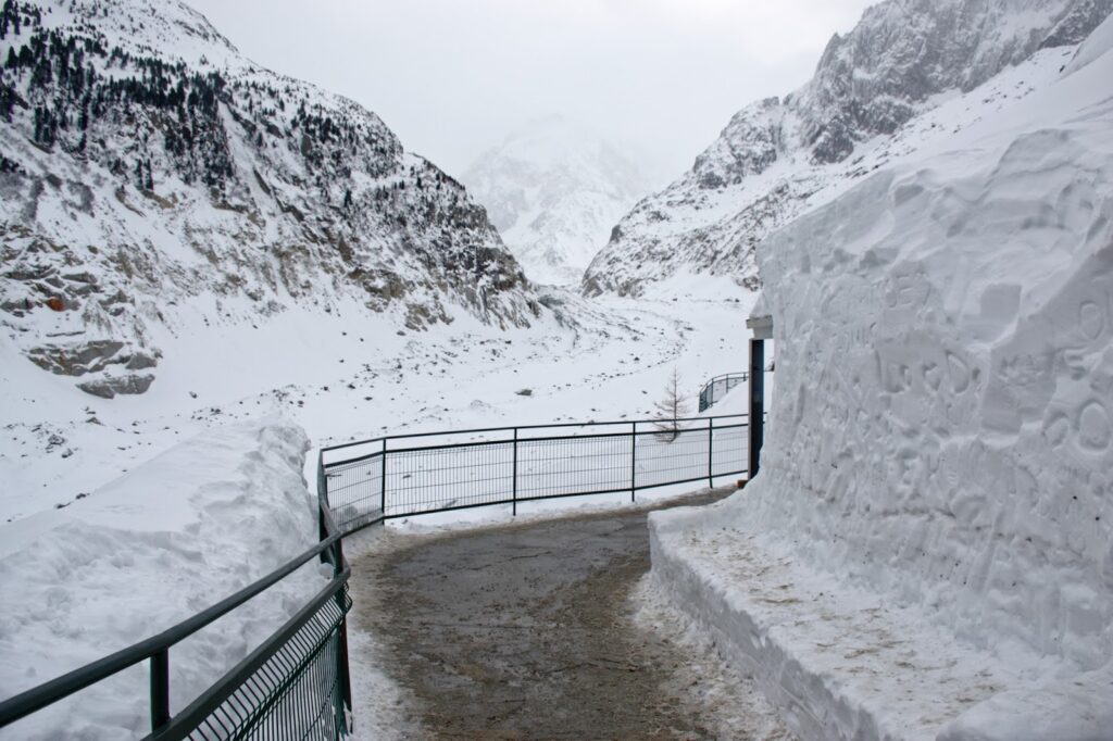 Il faut compter une vingtaine de minutes pour grimper jusqu’à la mer de glace, en hiver, le paysage est somptueux et vous avancerez au milieu de plusieurs dizaines de centimètres de neige – parfois à flanc de montagne. Vous passerez sur quelques viaducs et tunnels taillés dans la roche.