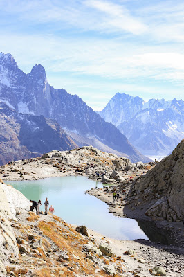 Nous voilà donc repartis, avec nos grosses doudounes de ski, écharpes, pulls, bottes et bonnets (je rappelle que nous allions à 3842m à la base). Seul le premier téléphérique était ouvert, il nous arrête donc à La Flégère. Sur internet, il me semblait avoir vu que depuis le téléphérique, il fallait seulement 1 heure pour monter jusqu’au Lac Blanc. Nous avons mis environ 2h30 (en même temps, on n’avait pas pensé à laisser tout notre bazard dans la voiture, et la montée sans chaussures adéquate est vite pénible), la montée est super raide, le paysage magnifique et changeant mais c’était vraiment très difficile ! Le Lac Blanc se situe à 2352m d’altitude et le téléphérique de la Flégère vous mène à 1877m. Il y a un second téléphérique qui vous mène plus haut encore mais il était fermé lorsque nous étions à Chamonix.