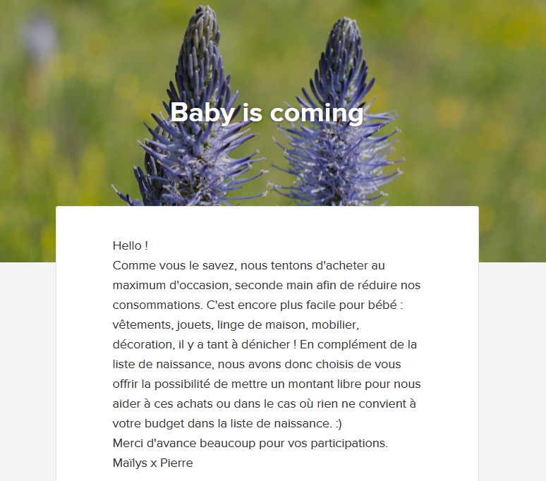 Aujourd’hui, il est aussi très courant d’opter pour une cagnotte. Que ce soit en passant par une plateforme comme Leetchi, Cagnotte.me. La plateforme Mes Envies permet de lier à notre liste de naissance, une cagnotte. L’argent est peut-être moins personnel que la liste de naissance, mais il peut s’avérer très utile. Dans notre cas par exemple, lorsque l’on veut au maximum acheter d’occasion mais qu’une aide financière n’est pas de refus. Ou afin que plusieurs personnes participent sur un même objet onéreux : poussette, lit bébé, siège auto, séance photo. Chaque personne peut donc mettre le montant qu’il souhaite, que ce soit 5€ ou 100€, cela permet une plus grande liberté de la part des participants, tout en étant d’une grande utilité aux futurs parents. L’argent permet aussi une utilisation tant immédiate que lointaine. On pourra s’en servir dès les premiers achats, ou pour lui offrir un cartable à la rentrée en crèche ou scolaire. En revanche, cela rend l’expérience moins humaine, moins intime.