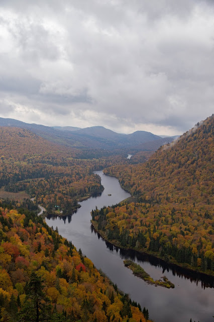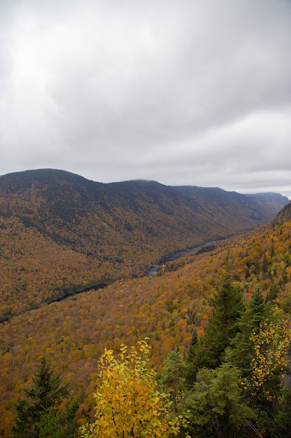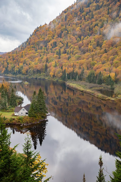 Le lundi, nous voilà partis en direction du parc de la Jacques Cartier pour la journée. Comme à presque toutes nos visites dans les parcs, il pleuvait et il y avait beaucoup de brouillard. Notre journée aura été rythmée par deux randonnées. Le parc est facilement accessible en voiture depuis Québec City, vous pouvez y organiser une seule journée ou dormir dans le parc et y passer plusieurs jours. Notre première randonnée à été la randonnée de l’Éperon. Une des plus connue et incontournable. Pour cette première randonnée, vous aurez le choix par deux côté, le premier, abrupt et le second plus tranquille. J’ai laissé choisir mon chéri qui à évidemment choisi le côté abrupt en premier. Bien sûr, j’ai râlé parce que franchement, il aurait pu choisir l’autre côté. Sauf que je vous conseille de faire comme nous. En choisissant la partie qui monte, vous aurez directement quelques belvédères, de jolies vues sur le parc. La redescente (par l’autre côté) est vraiment longue car au lieu de monter sec, elle contourne les montées. Le retour m’a paru interminable donc si vous commencez par là, j’imagine que la randonnée doit paraître encore bien plus longue. Vous vous enfoncez dans la forêt, pendant près de 30min. Nous avons mis 1h50 pour faire la boucle (en comptant les pauses photos bien sûr). La deuxième randonnée que j’avais sélectionnée était la randonnée La Scotora, sauf que le guide indiquait qu’elle faisait 16km et qu’il fallait environ 5h15. Avec cette pluie, on a laissé tombé. Nous avons choisi une troisième randonnée, moins longue mais tout aussi belle: Le sentier Les Loups. Ici, vous allez pouvoir admirer les massifs du parc, la rivière qui traverse le parc,  et toutes les belles couleurs automnales. Le sentier fait 11km, vous montez et descendez par le même chemin. Nous avons mis 3h15 pour faire la randonnée, prévue pour 3h30, c’était la première fois que nous mettions presque le temps indiqué. L’entrée dans le parc coûte 8,75$ par adulte comme pour tous les parcs gérés par le réseau Sépaq.