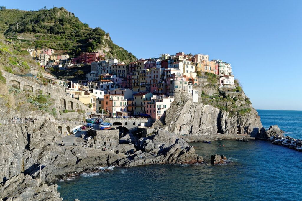 Puis vers 16h, on a repris la route vers les Cinque Terre. En faisant mes recherches, j’avais vu que pour vraiment visiter les Cinque Terre (comme son nom l’indique elles sont cinq villes), il fallait plusieurs jours. Toutes ces villes sont différentes mais celle qui m’avait le plus attirée était celle de Manarola. Grosse déception. Pour aller à Manarola les routes sont pleines de virages et pas forcément toujours très larges. Nous sommes passés par La Spezia puis au-dessus, et là, une fois au-dessus, nous nous sommes arrêtés au bord de la route pour admirer la vue ! La vue sur toute cette ville entre mer et montagne. Voilà ce que j’ai énormément apprécié sur cette partie de l’Italie, le fait d’être tout proche de la montagne tout en étant à quelques pas de la mer. C’était vraiment beau.