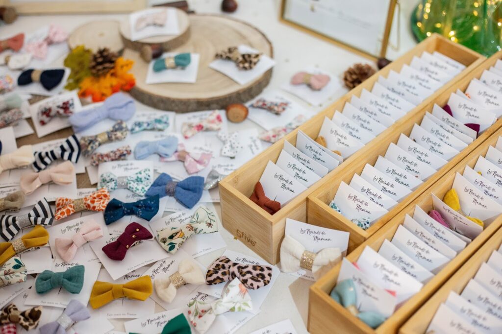 Qui n’a jamais voulu mettre de jolis nœuds assortis à une tenue ? Ceux-ci sont réalisés avec minutie par Justine. Son stand était la caverne d’Ali Baba pour les petits nœuds. Il y en avait de toutes les couleurs, avec un ou plusieurs petits détails changeants. Le nœud Romy bleu azur est particulièrement élégant mais à vous de choisir celui que vous préférez sur son site internet. Justine réalise aussi des bandeaux et des nœuds papillons. Allez jeter un œil, vous allez adorer.