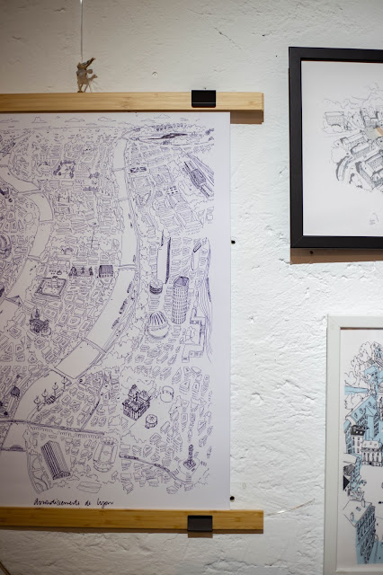 Si les affiches et cartes présentées m’ont déjà impressionnée par leur précision et leurs détails, j’ai été complètement subjuguée par tout le processus par lequel doit passer Émilie avant d’arriver à ce résultat final ! Commençons par le début : tout est dessiné à la main puis reproduit ensuite sur divers supports. Chaque détail, chaque trait, à été fait à main levée. Comment arrive t’elle a un tel résultat ? Tout simplement en se rendant dans la ville, elle observe le quartier, les immeubles, fait des croquis, elle se représente la hauteur, note le nombre d’étage, la présence de verdure ou non. Puis elle se rend sur une Maps en ligne, comme Google Maps par exemple, elle regarde de haut les rues, leurs courbes, leur nombre, leurs intersections. Google View peut aussi l’aider, car les rues ont souvent été cartographiées, filmées, ce qui peut aider à préciser telle ou telle chose. Enfin, il y a aussi les archives des villes, surtout pour les plus vieux bâtiments. Ils aident à peaufiner les détails, être au plus proche de la véritable architecture. Toutes ces recherches, tous ces croquis, mènerons au dessin final que vous pouvez avoir dans vos mains. Cartes de vœux, agendas, cartes postales, calendrier, posters, carnets, affiches. De la ville globale, d’un quartier ou d’un monument en particulier. Pour le moment, il y a surtout Paris, Marseille et Lyon (mais aussi Bordeaux, Lille, Dieppe), pour ma part, j’attends Annecy.