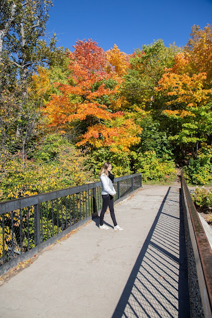 A votre arrivée dans le parc, vous paierez 8$ d’entrée et 4$ de parking. Le parc est gratuit pour les résidents de Québec et je me suis demandée si cela fonctionnait lorsqu’on louait un logement à Québec. Cela vous donne accès aux deux entrées, celle d’en haut et celle d’en bas pour toute une journée. Ils vous donnent des bracelets pour preuve de paiement. En temps normal, vous pouvez joindre le haut et le bas des chutes par un grand escalier. Il était en rénovation au moment de notre voyage, nous avons pu accéder au bas des chutes grâce à un autre sentier aménagé qui passe au-delà de la voie ferrée. C’était très impressionnant de se retrouver ainsi au pied de la Chute. D’ici, on pouvait voir la passerelle qui enjambe, le téléphérique qui fait la liaison et la tyrolienne qui passe devant les chutes ainsi que la via ferratta. L’accès aux escaliers était fermé mais que depuis en bas, on pouvait tout de même les monter/descendre depuis en haut. Pour accéder à la partie haute des chutes, il y avait deux solutions : prendre le téléphérique au tarif de 14$ par personne ou ressortir en voiture et entrer par en haut. Comme vous avez pu le lire, on a choisi la deuxième option. En haut, vous pourrez découvrir le très chic manoir Montmorency. Le bâtiment est vraiment très élégant, il y a des évènements qui se passent à l’intérieur, une boutique souvenir et un restaurant si mes souvenirs sont bons. Nous avons ensuite franchi la passerelle qui nous mènerait de l’autre côté des chutes. Je peux vous assurer que je ne faisais clairement pas la maligne, suspendue au-dessus des chutes comme ça avec une passerelle où l’on voit entre deux planches. Dans le bas du parc, nous avons trouvé une entrée qui donne sur un quartier a l’air hyper chic. Vous voyez les maisons des films américains ? Toutes identiques, avec une parcelle de terrain bien définie, bien entretenue, des rues parfaitement propres, etc ? Et bien c’était exactement ça. Vous pouvez d’ailleurs sortir du parc pour aller vous y promener et rentrer à nouveau ensuite. Je me suis imaginée que les Québécois devaient connaitre cette entrée car elle évite de faire la queue puisqu’il n’y a pas de billetterie de ce côté-là (attention, si vous n’êtes pas Québécois vous devez vous acquitter d’un droit d’entrée même quand vous ne passez pas devant la billetterie, comme pour les parcs nationaux).