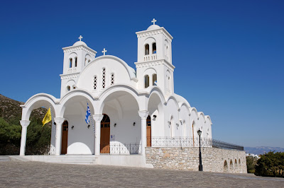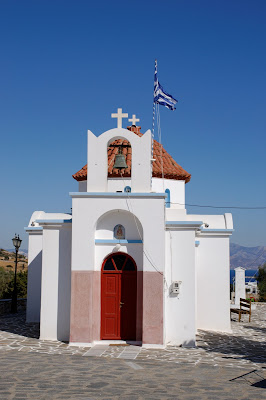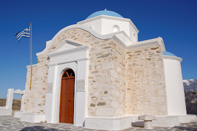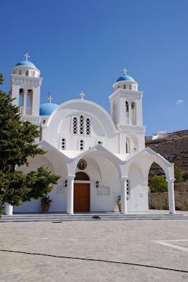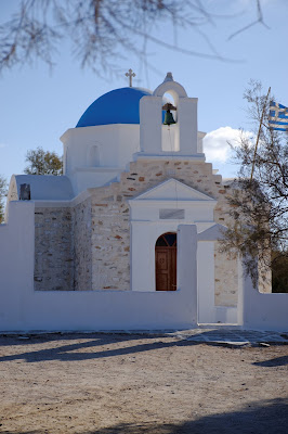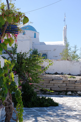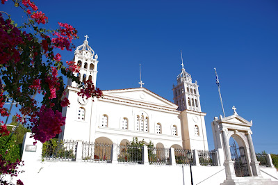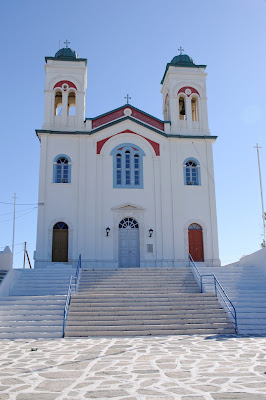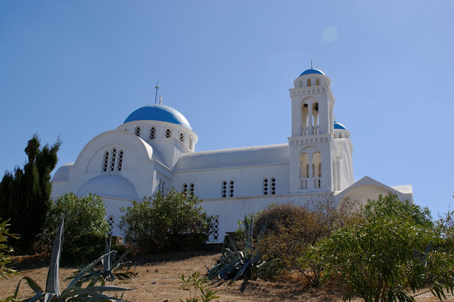 Capitale de l’île, aussitôt baptisée « Paprika » par mon chéri. Nous avons pris le temps de la visiter le dernier jour, en fin d’après-midi. Toujours pleine de monde, après Milos où il n’y avait jamais personne, ça fait un peu drôle. Nous avons commencé par l’Église Orthodoxe : l’Église est entourée d’un bâtiment tout neuf qui abrite une maison de retraite. Dans la vieille Église, les photos sont interdites, il faut évidemment une tenue correcte pour entrer (des foulards sont à disposition à l’entrée pour ceux qui seraient en short), et le téléphone portable est également interdit. Ce qui a le plus retenu mon attention, sont ces plaques de vœux attachées à chaque statue des Saints présents. Sur chaque plaque, il y a un dessin, qui représente le vœu que tu souhaite faire, tu l’attache ensuite au pied de la représentation du ou des Saints à qui tu adresse ta demande. J’ai trouvé ce concept plutôt intéressant, ici c’est la première fois que je le voyais mais j’ai pu le revoir ensuite à Athènes.