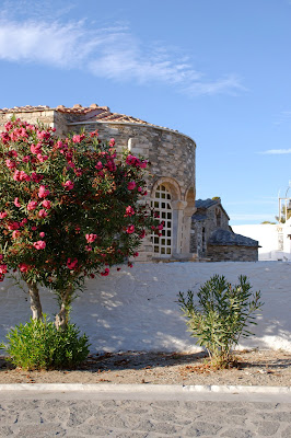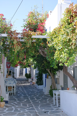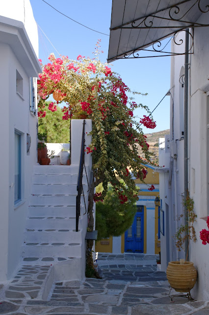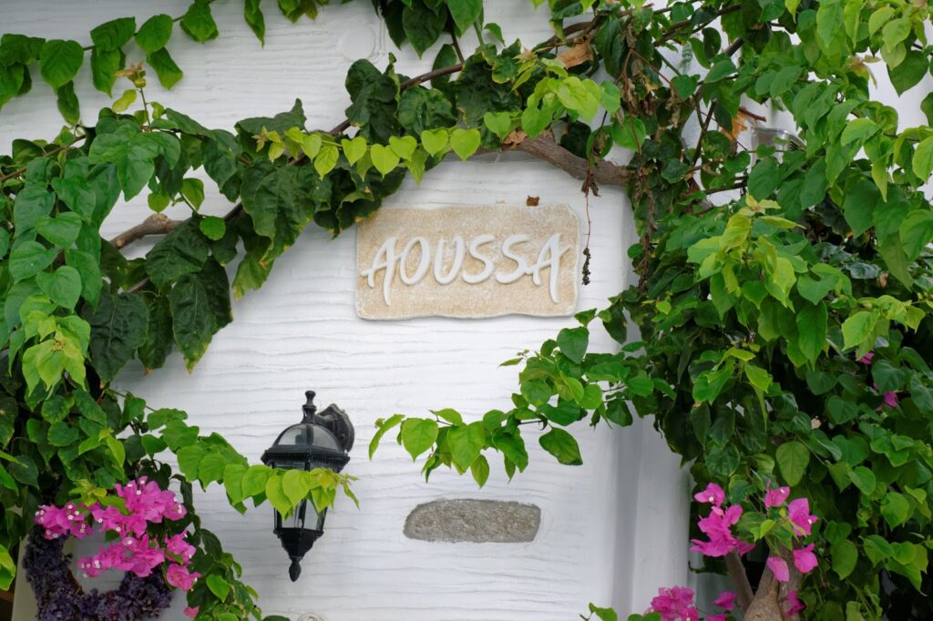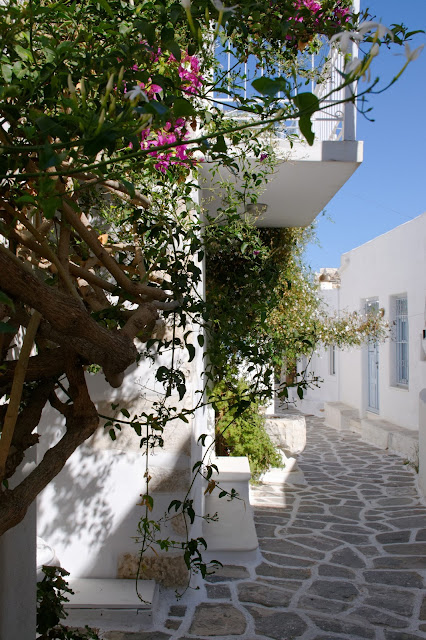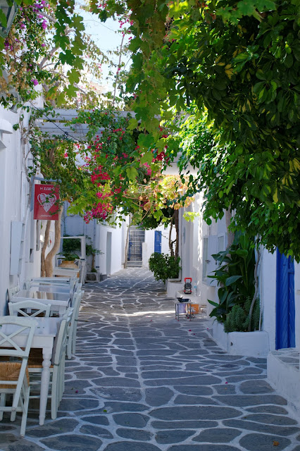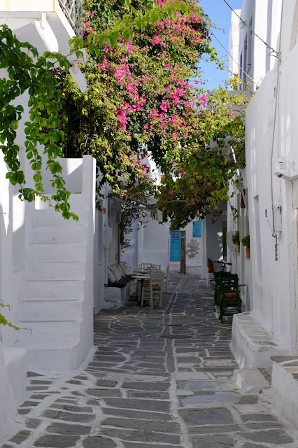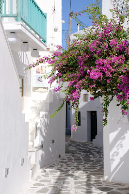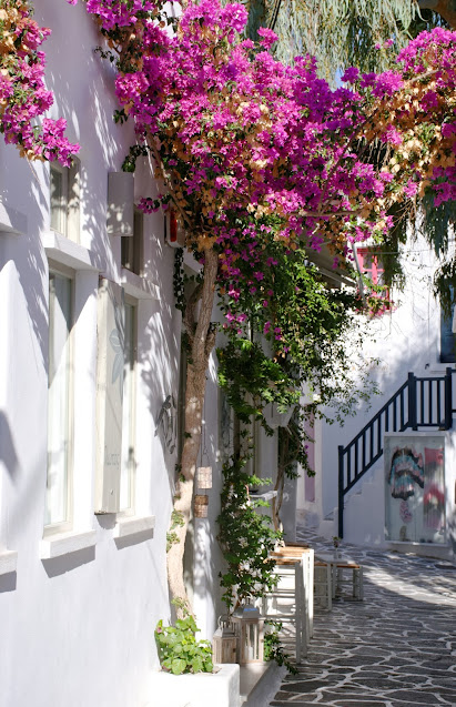 Tout en haut de Naousa, il y a une Église qui surplombe la ville. L’endroit donne d’un côté sur la mer et de l’autre sur les montagnes. L’accès n’est pas difficile et on ne se rend même pas compte que nous montons tellement se balader dans ces ruelles bourrées de charme nous ravi. Toutes ces petites ruelles sont fleuries, mais jamais de la même manière, ce qui fait que chacune d’elle à son charme. Rue après rue, nous découvrons des arbres roses, de jolies portes pastels, des volets assortis; des passages où la verdure passe au-dessus de nos têtes en arc.