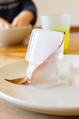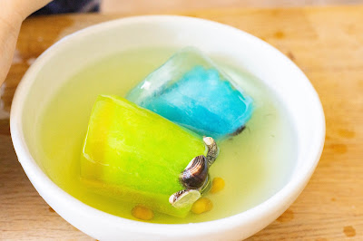 « Glace à l’eau » : l’idée était de préparer de petites potions avec les enfants. Prendre un verre d’eau, y mettre du colorant, des petits objets, selon le choix de l’enfant et mettre le tout au congélateur. Patienter. Ressortir et décongeler. Les enfants ont adoré. Ils ont choisi ce qu’ils voulaient mettre dedans avec grand soin : couleurs, coquillages ,billes, fleurs, etc. Ils étaient très curieux de savoir ce qui allait se passer en le mettant au congélateur, pour eux, c’est juste la place des glaces. Lorsque le lendemain on a ressorti tout ça, ils étaient excités de voir le résultat et se souvenaient très bien de ce que l’on avait fait la veille. Jacques, 2ans ½, m’a dit « C’est glaçon » lorsqu’il a vu ce qu’était devenue son eau. Ils ont été très impatients car il fallait attendre que ça fonde un peu pour pouvoir le démouler – ils sont venus vérifier dans la cuisine environ toutes les deux minutes. Cette impatience était toujours là quand il s’agissait de patienter pour pouvoir récupérer les objets. On a donc accéléré le processus avec de l’eau chaude, soit qu’ils versaient dessus, soit dans laquelle ils trempaient le glaçon. Ils ont eu du mal à toucher le glaçon du moment où c’était vraiment froid (faut dire qu’on était en hiver aussi). Ils étaient vraiment ravis de pouvoir récupérer leurs petits objets.