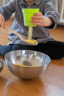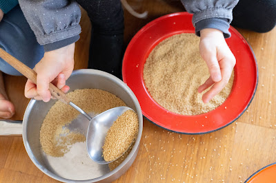 « Écoute pour voir » : ici, il s’agissait d’écouter les sons. De choisir des contenants pareil mais de diversifier ce qui se trouvait dedans. Ils ont été très intrigués par la préparation. Colette a d’abord essayé d’écouter mais les différences n’étaient pas flagrantes. Jacques, quant a lui, a d’abord et surtout observé sa sœur faire. Il a essayé de taper sur les contenants avec une cuillère, puis finalement, ça s’est terminé en transvasement. Quant à sa sœur, elle est allée dans sa cuisine chercher un contenant avec des trous au fond pour faire aussi du transvasement. Personnellement je n’ai pas trop apprécié cette activité car on a utilisé de la nourriture et je ne voulait pas faire de gaspillage, ni que les enfants mélangent tout. Si je devais recommencer, je mettrai moins de choses et des choses qu’ils peuvent se mélanger sans soucis.