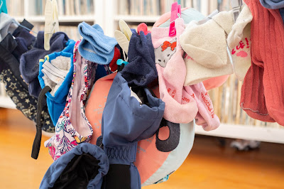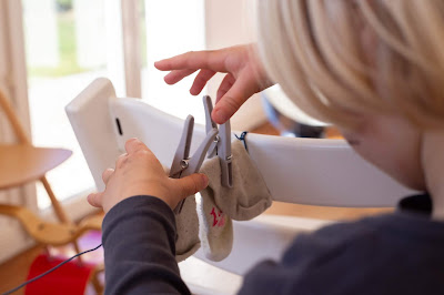 « Chaussettes dépareillées » : là, il fallait tout simplement défaire les paires de chaussettes, les paires de gants, tout mélanger et laisser les enfants remettre les paires. Tout le monde a adoré ! La mise en place est pratique et rapide. L’objectif simple et facile a expliquer. Les enfants comprennent très vite le principe. Ils se sont beaucoup entraidés? Quand chacun avait un bout de la chaussette ils échangeaient ou les mettaient ensemble sur le fil. L’accrochage avec les pinces à linge a été difficile pour Jacques, il a demandé de l’aide à moi ou à sa sœur puis il a fini par juste les déposer en équilibre sur le fil. Cette dernière option lui a offert un nouveau challenge. Colette en a profité pour détourner un peu l’activité, elle s’amusait avec son équilibre, se mettre sur un pied et se baisser sur un pied pour attraper les chaussettes. L’autre détournement qu’ils ont fait a été l’empilement : ils ont empilé ensemble les chaussettes sur le fil, comme nous avions mis aussi des choses un peu plus lourdes (brassards, gants et moufles) le fil s’est abaissé ce qui a amené une nouvelle activité. Jacques s’est donc rendu compte qu’en mettant les chaussettes à une des extrémités (il a testé un seul côté), elles descendaient sur le fil jusqu’à l’endroit affaissé. Il a donc fait ça avec toutes les dernières chaussettes, tout en prenant soin de mettre bien les « même même » côte à côte. Pour l’adulte, ce jeu est sans prise de tête, j’ai beaucoup aimé l’ambiance, l’atmosphère, l’entraide. Ça a duré environ 15/20 minutes. Les enfants étaient enthousiastes et volontaires. Je leur ai ensuite demandé de m’aider à ranger, en gardant le même principe de m’amener les chaussettes par paires – ils ont adoré ! Du coup, même encore aujourd’hui je laisse les chaussettes en vrac et leur demande de me donner les paires pour que je les plie.
